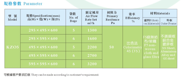 本公司采用的濾材為三層濾料均勻熱熔粘合。第一層粗纖維過濾棉捕捉空氣中較大的塵埃,較細(xì)的纖維濾紙捕捉空氣中較小的塵埃,最外層無紡布為強(qiáng)化保護(hù)層。合理的三層設(shè)計(jì)使產(chǎn)品具有優(yōu)良的性能,牢固的熱熔技術(shù)避免了風(fēng)壓產(chǎn)生的泄露,隔網(wǎng)避免了袋與袋之間的貼合,更加細(xì)化了送風(fēng)區(qū)域,降低了阻力,并使容塵量達(dá)到了最大。